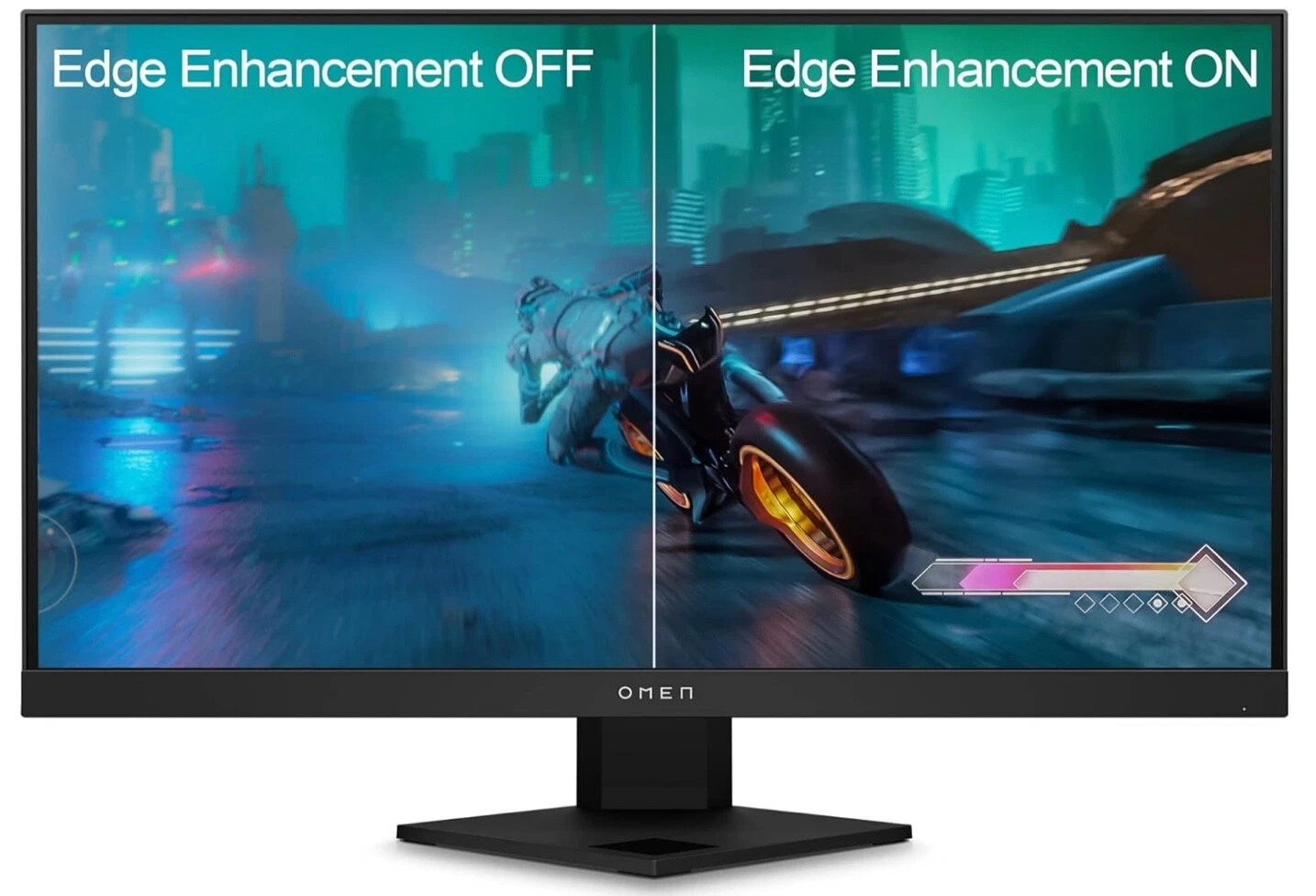 HP includes gaming enhancements like Shadow Vision, which brightens dark areas without overexposing, and Edge Precision for fine-tuning in competitive play.